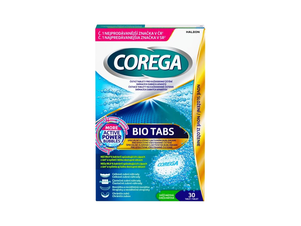 Čistící tablety na protézy COREGA 4v1 pro každodenní použití nabízí hluboké čištění i v místech těžko dostupných zubním kartáčkem. Ničí 99,9 % bakterií, které se usazují na zubní náhradě a mohou pak způsobovat zápach z úst.