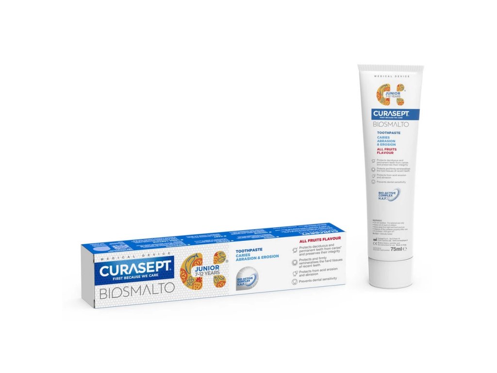 Zubní pasta CURASEPT BIOSMALTO Junior s ovocnou příchutí, zabraňuje tvorbě zubního kazu a plaku, posiluje tvrdé tkáně při jejich řezání, chrání mléčné zuby během fáze výměny, před erozí kyselinami a brání citlivosti zubů.
