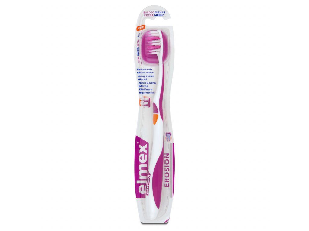 Elmex Erosion je extra měkký kartáček s hedvábně extra měkkými vlákny, který jemně čistí jak povrch zubů, tak i mezizubní prostory, díky svým víceúrovňovým kartáčových štětinám.
