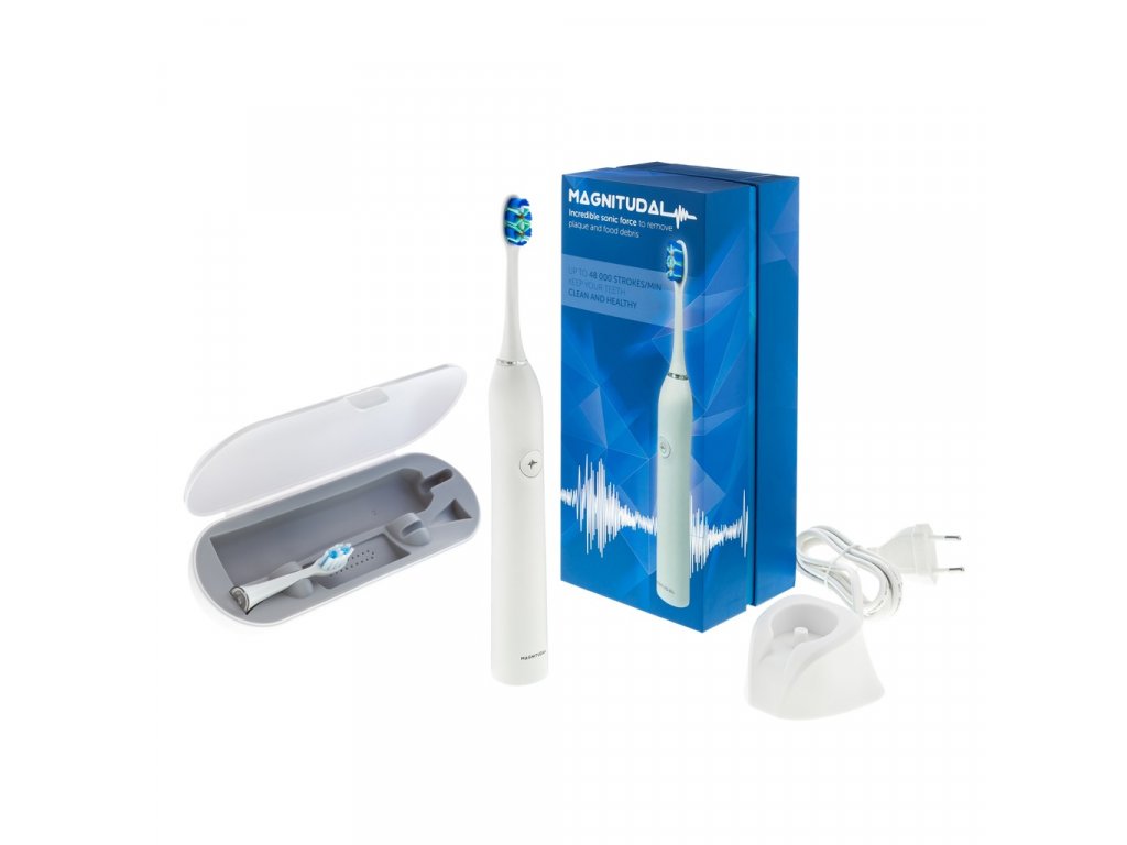 Představujeme vám moderní sonický zubní kartáček Magnitudal Quake, který vám pomůže dovést čištění zubů k dokonalosti. Při čištění dosahuje až 48 000 vibrací za minutu a pomáhá tak efektivně, ale přesto šetrně odstraňovat zubní plak.