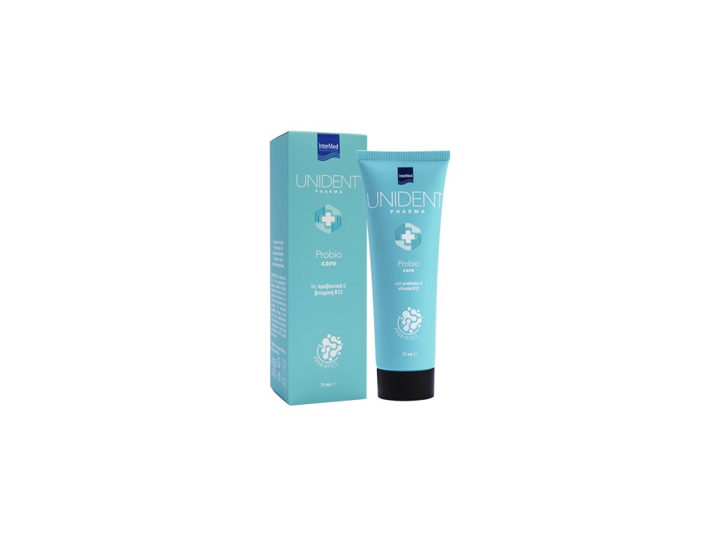 Unident Pharma Probio Care je každodenní fluoridová zubní pasta speciálně vyvinutá pro ochranu ústní dutiny a dásní. Díky obsahu probiotik a vitaminu B12 podporuje rovnováhu ústního mikrobiomu.
