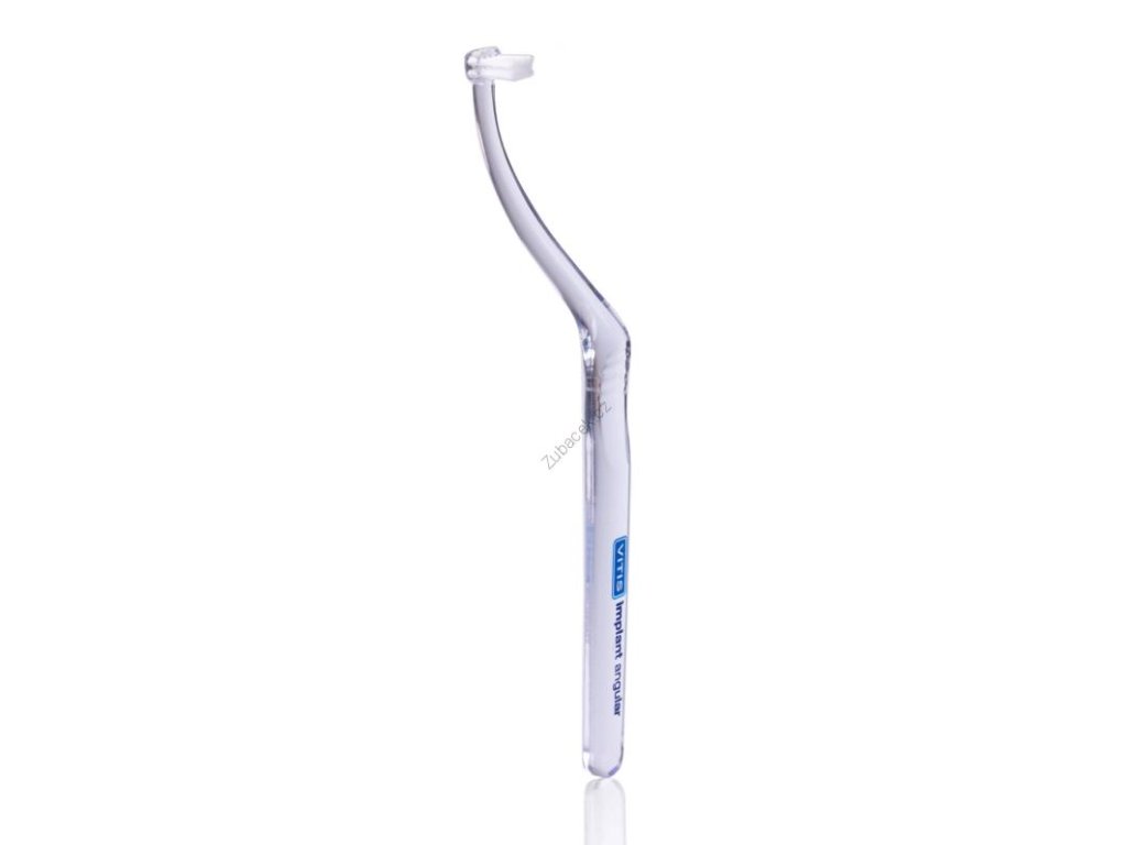 VITIS IMPLANT ANGULAR speciálně navržený zubní kartáček s malou hlavicí umožňující odstranění plaku z implantátů a zubních náhrad v hůře dostupných částech úst. Rukojeť je tvarována tak, aby hlavice kartáčku snadno dosáhla a efektivně vyčistila implantáty z vnitřní strany úst.